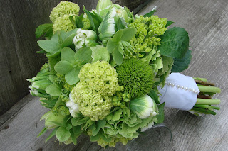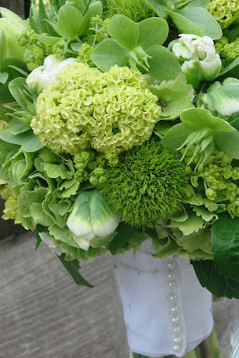 The bridesmaids carried all white with hydrangea, sweet peas, parrot tulips, and ranunculus.  The stems were wrapped in grey and held with pearl pins.  The bridesmaids wore green dresses.