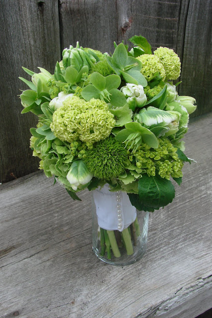 Sarah carried all green with double and parrot tulips, green dianthus, viburnum, lady’s mantle, hydrangea, and one of my favorites – heleborus!