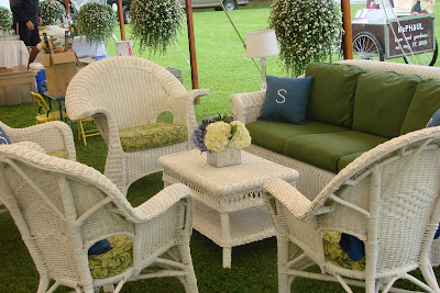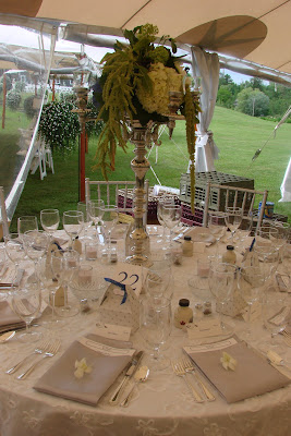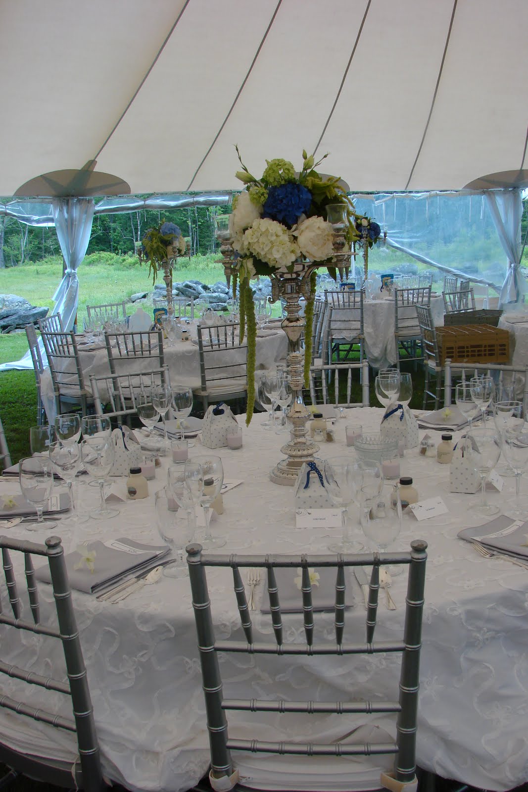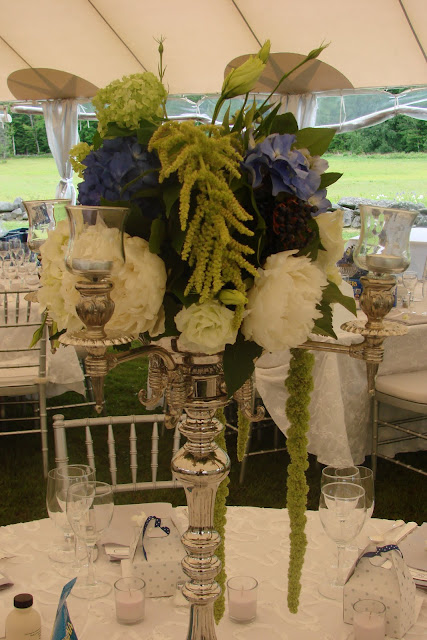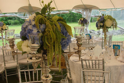 For this formal outdoor wedding, hydrangea, delphinium, peonies, sweet peas, nigelia, tweedia, hosta, dusty miller and more were use in the arrangements and bouquets. Silver candelabras on round tables, and square silver cubes on the square tables…formal, elegant, and so beautiful!