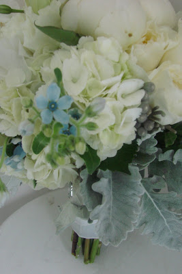 Blue tweedia and dusty miller reflected the silver and blue theme colors.