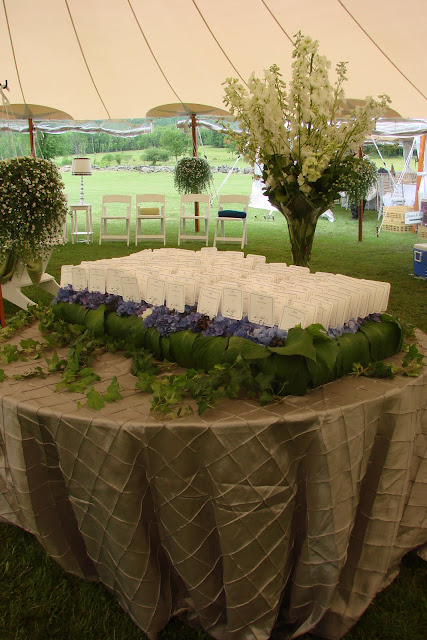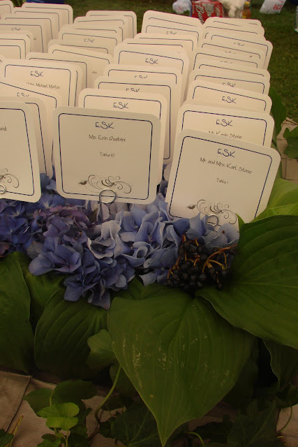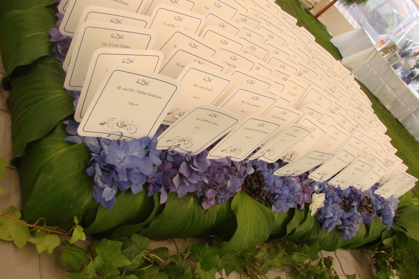 A platform of all Dutch blue hydrangea surrounded with hosta leaves showcased EB and Karl’s escort cards.
