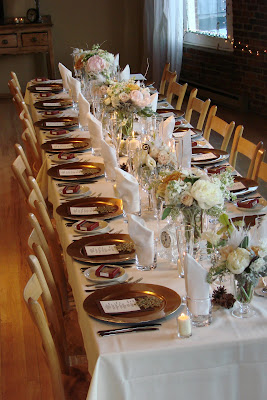 We choose glass pedestal style vases to complement the beautiful glass of Simon Pearce to be clustered down long farm tables.