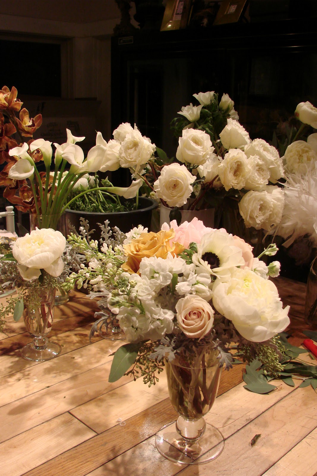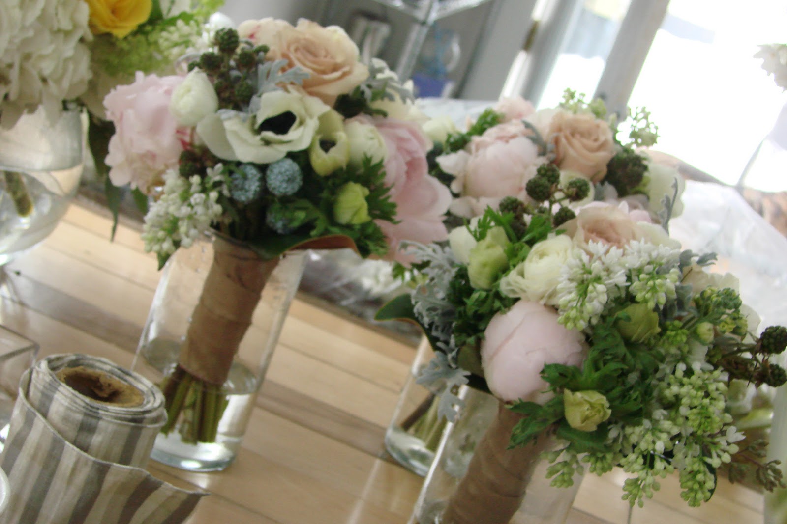 Garden roses, anemones, roses, lilacs, and more were used to create the centerpieces and bouquets