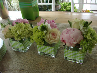 The rehearsal dinner on Friday welcomed guests with many small arrangements with the colors and flowers giving a sneak peek of what was to come on Saturday. Sarah Bernhard pink peonies, lime green hydrangea, viburnum, roses and more were combined together in small 3″ clear glass cubes and clustered on each table. The many small arrangements came in useful for the next days events…